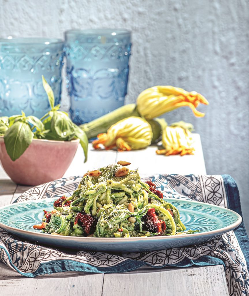 Σαλάτα με σπαγγέτι κολοκυθιού, πέστο βασιλικού και λιαστές ντομάτες