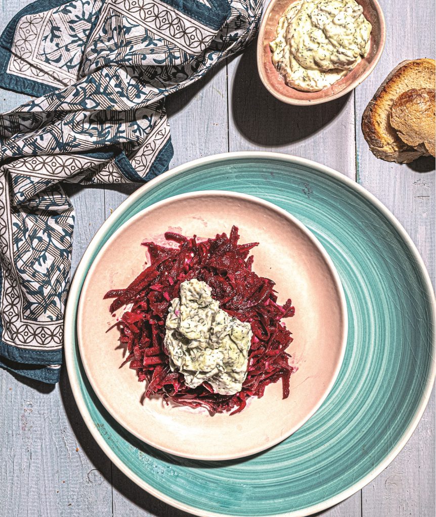 Κρέμα γκοργκοντζόλα με παντζάρι, μαριναρισμένο σε τζίντζερ και λεμόνι
