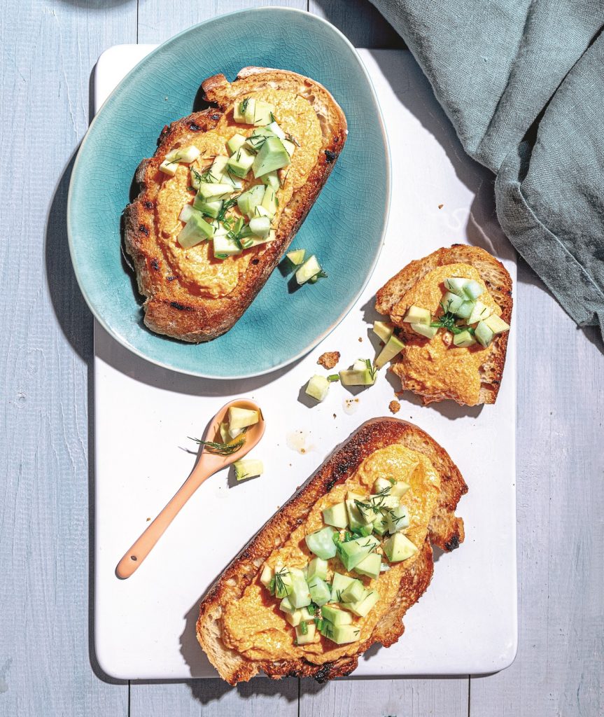 Φρυγανισμένο ψωμί με τυροκαυτερή & ταρτάρ αγγουριού με αβοκάντο