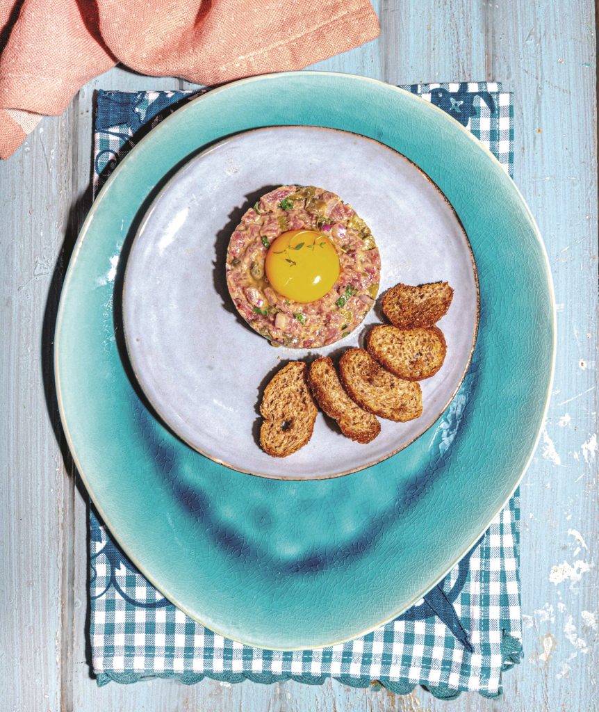 Φτιάχνουμε ένα μπιφτέκι με τα χέρια μας ή το φορμάρουμε στο πιάτο με ένα μικρό τσέρκι. Πιέζουμε ελαφρά την επιφάνεια και τοποθετούμε από πάνω τον κρόκο αυγού.