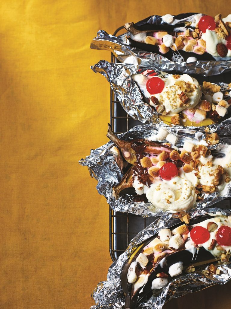 Κόβουμε τις μπανάνες με τη φλούδα κατά μήκος στη μέση και τις ανοίγουμε σε σχήμα πεταλούδας. Δηλαδή δεν κόβουμε τις μπανάνες μας τελείως μεχρι κάτω. Τις βάζουμε μέσα σε αλουμινόχαρτο, ρίχνουμε στη μέση τα μικρά κομματάκια σοκολάτας και marshmallows, τις τοποθετούμε σε ένα ταψί και τις ψήνουμε στους 200°C στον αέρα για 15΄-20΄.