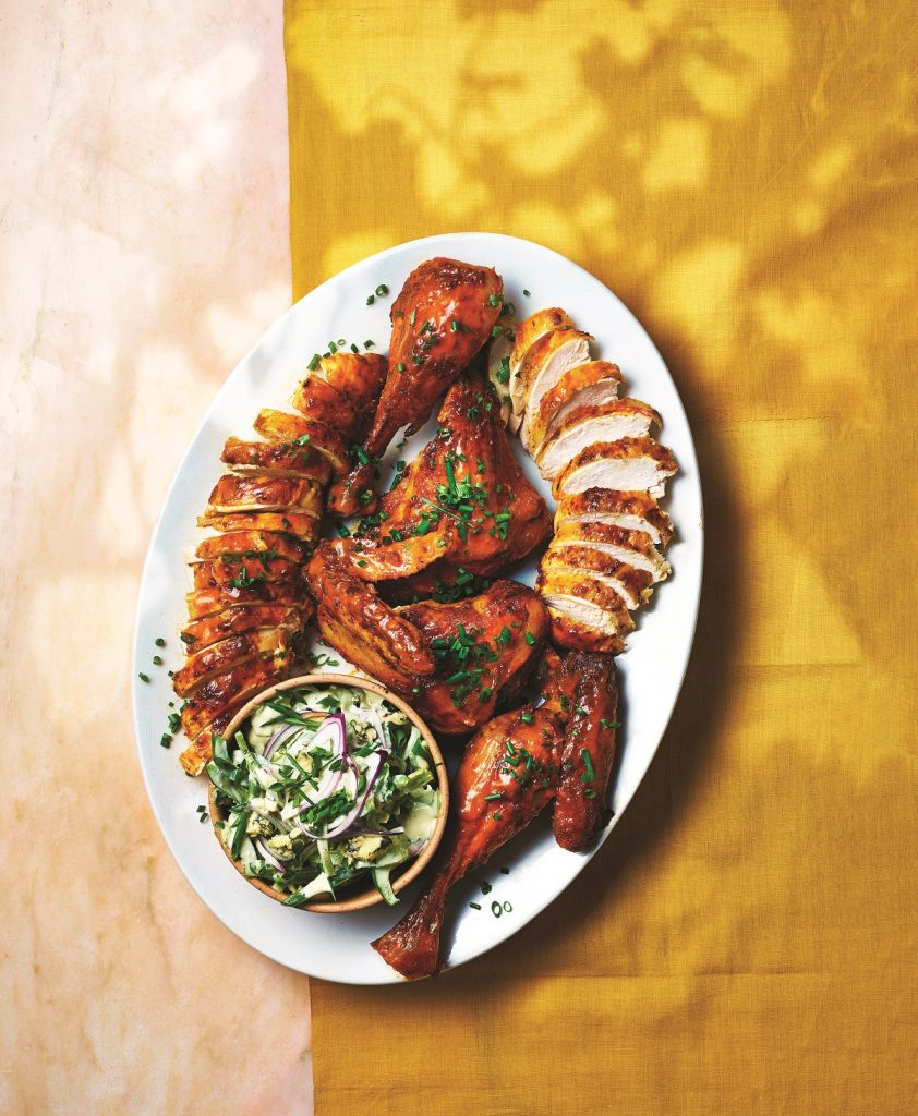 Μαρίναδα: Σε ένα μπολ βάζουμε όλα τα υλικά και ανακατεύουμε καλά. Στη συνέχεια αλείφουμε το κοτόπουλο με τη μαρινάδα μας. Το βάζουμε σε ένα ταψί, το καλύπτουμε με μεμβράνη και το αφήνουμε στο ψυγείο για 1 ώρα.