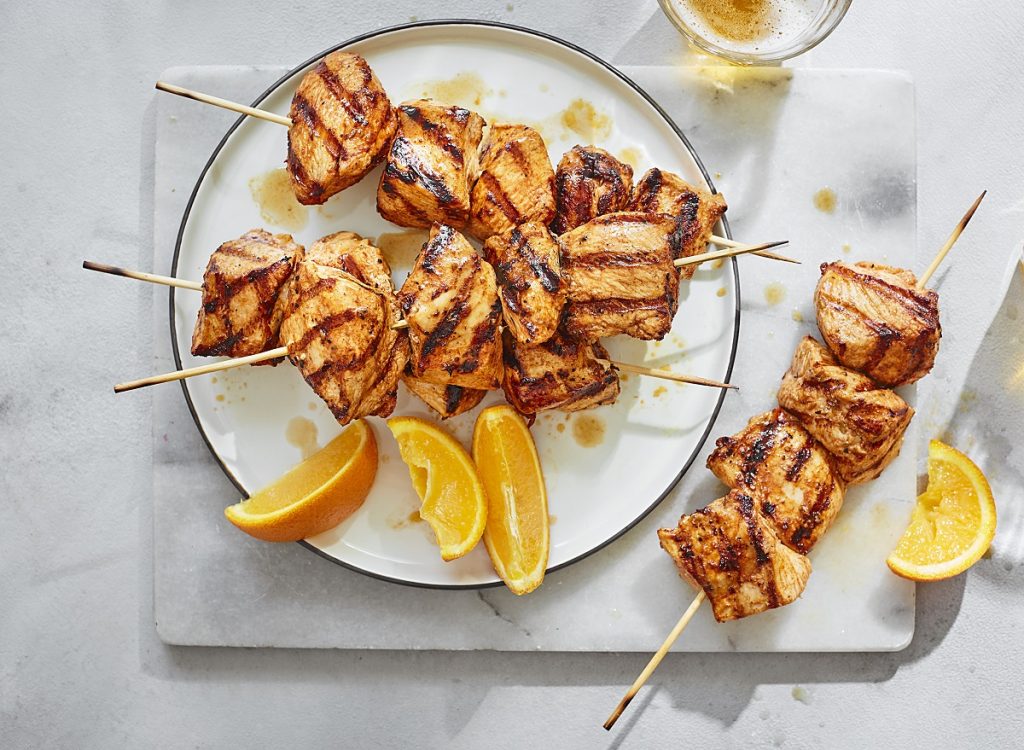 Αν θέλουμε μπορούμε να περάσουμε τα κομμάτια κοτόπουλου σε ξύλινα σουβλάκια και να τα σερβίρουμε με μερικές φέτες πορτοκάλι από πάνω.