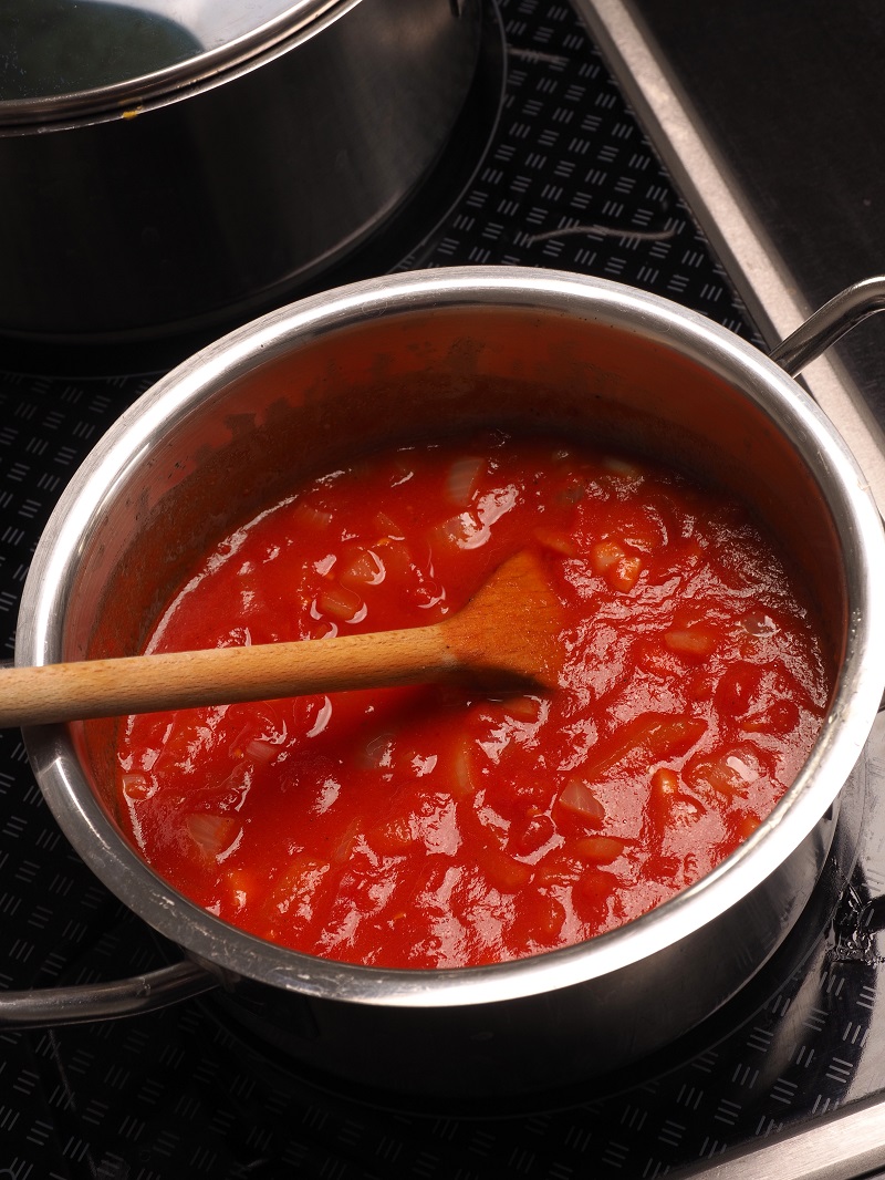 Βράζουμε τις ντομάτες σε δυνατή φωτιά, χωρίς καπάκι, μέχρι να εξατμιστούν σχεδόν όλα τα υγρά.