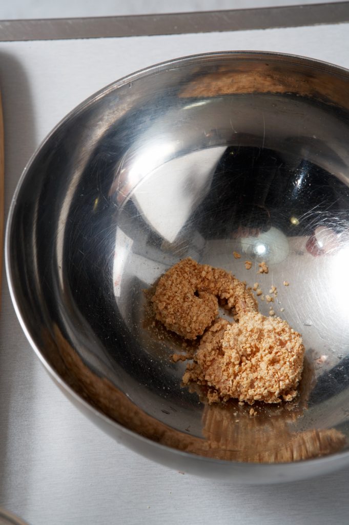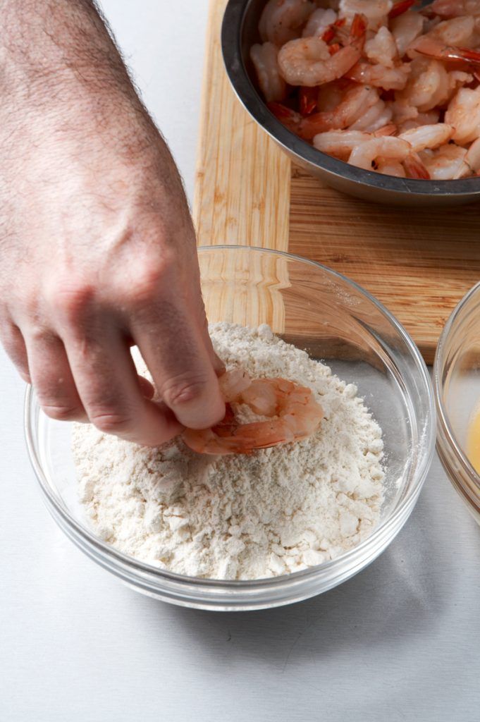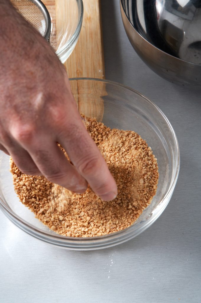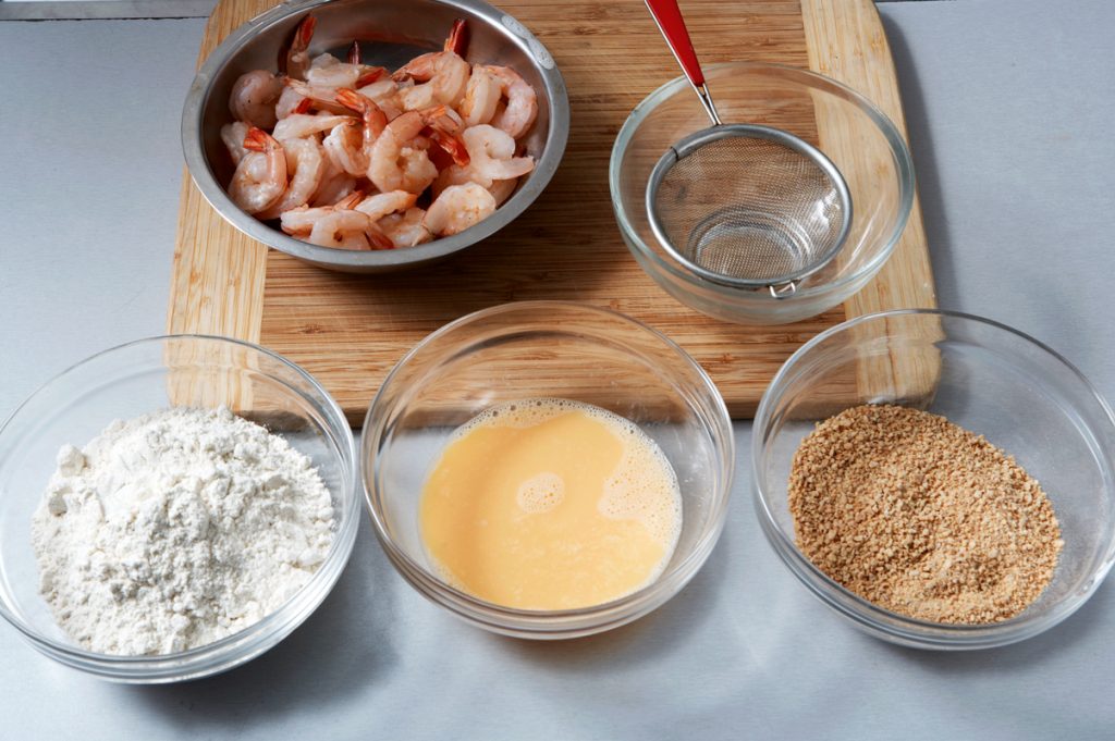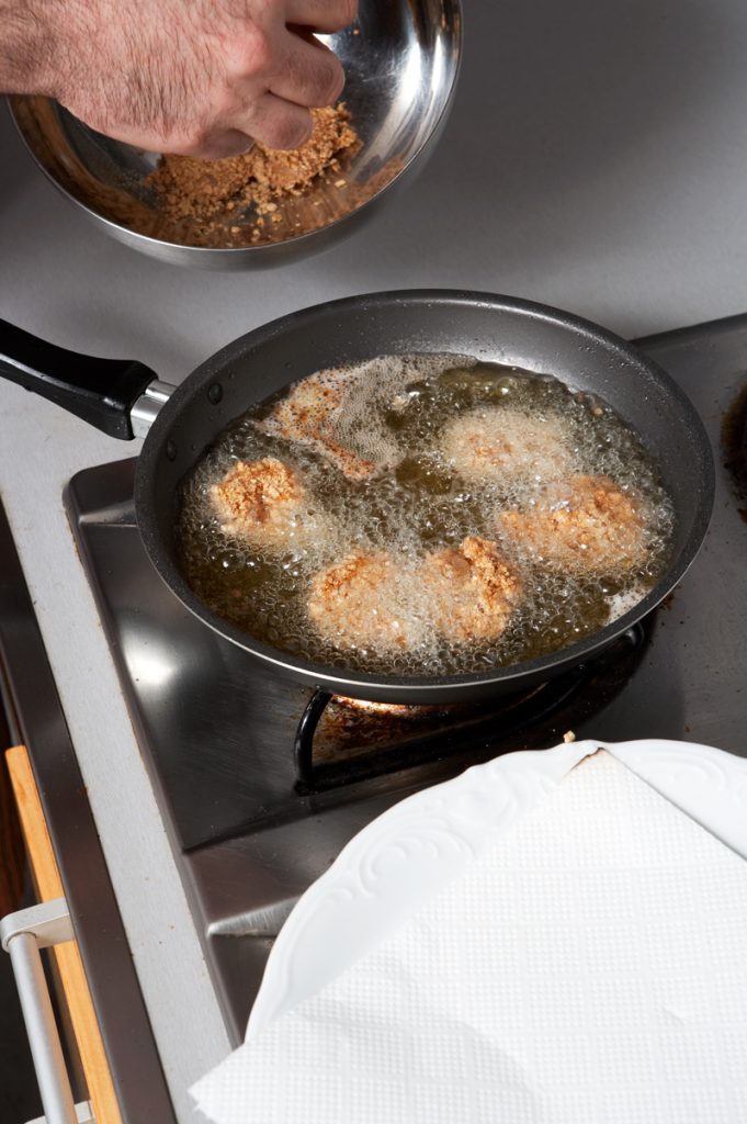 1. Τοποθετούμε σε τρία σκεύη (κατά προτίμηση με τοιχώματα) και με την εξής σειρά, το αλεύρι, το χτυπημένο αβγό και τη γαλέτα ή την αντικατάστασή της. Μεταξύ του αβγού και της γαλέτας τοποθετούμε ένα άδειο σκεύος με μια σήτα χειρός (σουρωτήρι).