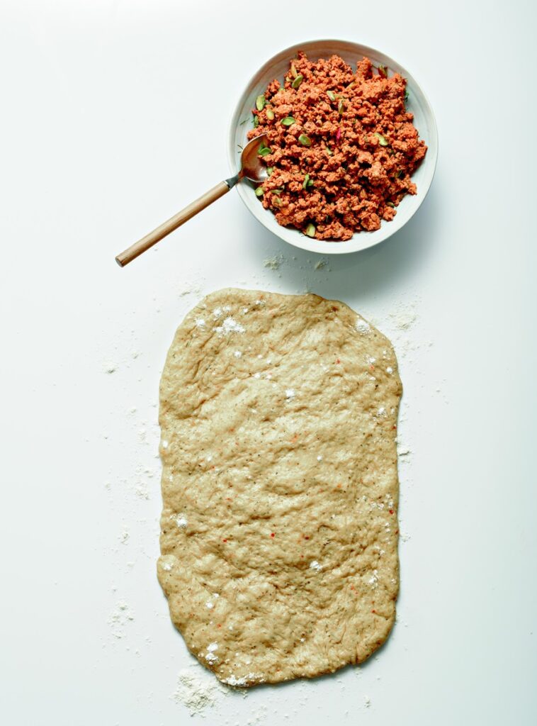 Ζύμη: Σε κατσαρόλα με βαρύ πάτο ζεσταίνουμε το βούτυρο με το μισό από το ελαιόλαδο και σοτάρουμε τον κιμά μαζί με όλα τα μπαχαρικά, εκτός από τον κρόκο, τη δάφνη και το μοσχοκάρυδο. Μόλις αρχίσει να παίρνει χρώμα, προσθέτουμε το κρεμμύδι και το καρότο. Σβήνουμε με τη μαυροδάφνη και τον χυμό πορτοκαλιού.