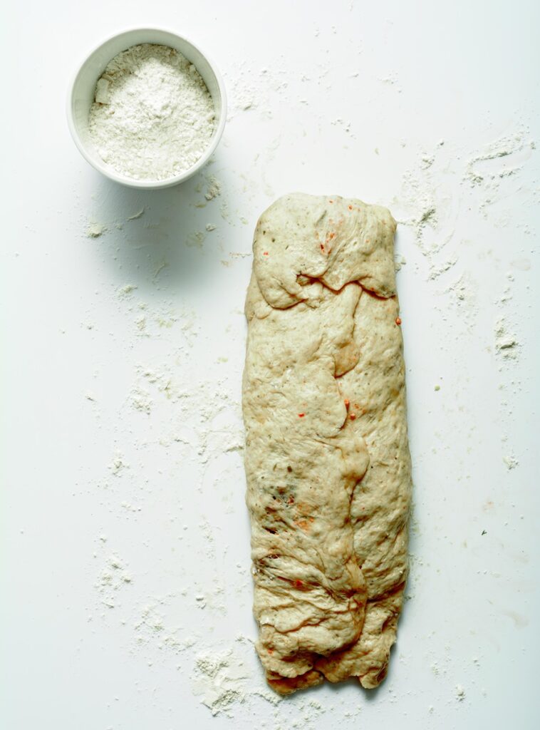 Μόλις ανέβει, διπλώνουμε τη ζύμη περιμετρικά, τραβώντας από κάτω προς τα πάνω. Αφήνουμε για 20΄ και επαναλαμβάνουμε ξανά. Στη συνέχεια κάνουμε δύο διπλώματα με τα δύο χέρια -σαν να διπλώνουμε πετσέτα- επίσης ανά 20΄και την αφήνουμε να ξεκουραστεί άλλη ½ ώρα.