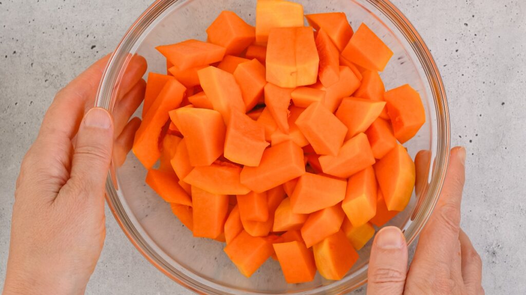 Αφού ξεφλουδίσουμε την κολοκύθα θα κόψουμε τον λαιμό της, χωρίζοντάς την από το υπόλοιπο σώμα της. Ο λαιμός δεν έχει σπόρια, οπότε μπορούμε στη συνέχεια να την τεμαχίσουμε αρχικά σε στρογγυλές φέτες, τις οποίες έπειτα θα τεμαχίσουμε εύκολα σε κύβους. Όσο για το στρογγυλό σώμα της που έχει σπόρια, αφού το κόψουμε στη μέση, αφαιρούμε τα σπόρια με ένα κουτάλι της σούπας και το τεμαχίζουμε πάλι σε ημικύκλια, τα οποία έπειτα κόβουμε σε κυβάκια ή σε όποιο άλλο σχήμα απαιτεί η συνταγή μας.