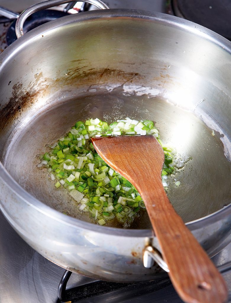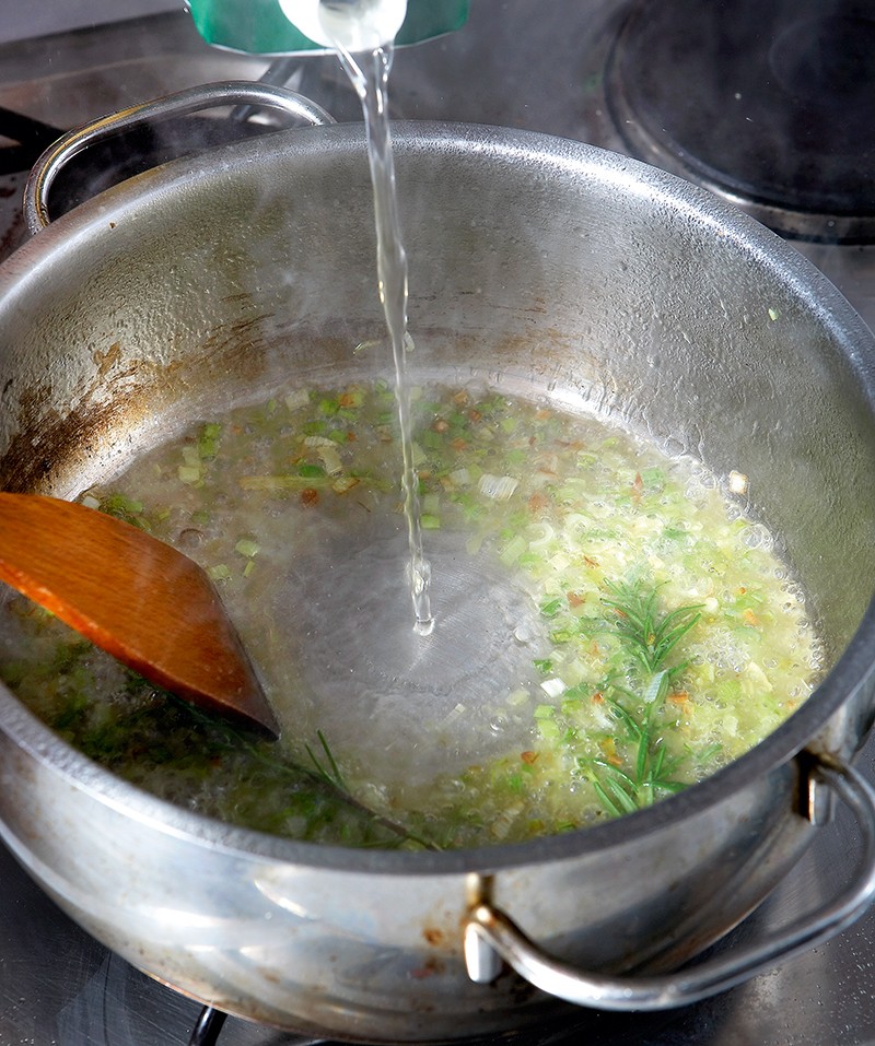 1. Ιδρώνουμε τα αρωματικά λαχανικά (κρεμμύδι, καρότο, σέλερι κ.λπ.) με λάδι ή βούτυρο μέχρι να μαλακώσουν και τα αλατίζουμε.