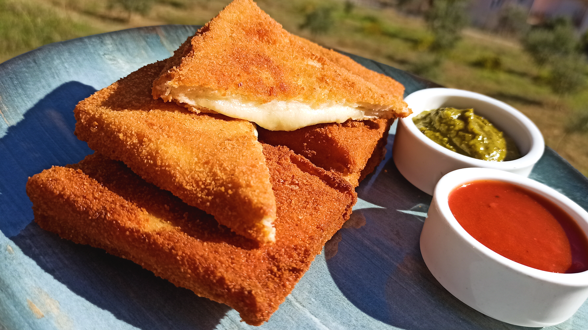 Περνάμε τις φέτες μας πρώτα στο αλεύρι, μετά στο αυγό και τέλος στην τριμμένη φρυγανιά. Τηγανίζουμε σε ηλιέλαιο για ελάχιστο χρόνο μέχρι να πάρουν εξωτερικά το χρυσαφένιο καλοψημένο χρώμα. Σερβίρουμε με πέστο βασιλικού, τσίλι, ΒΒQ sauce ή ό,τι άλλο μας αρέσει.