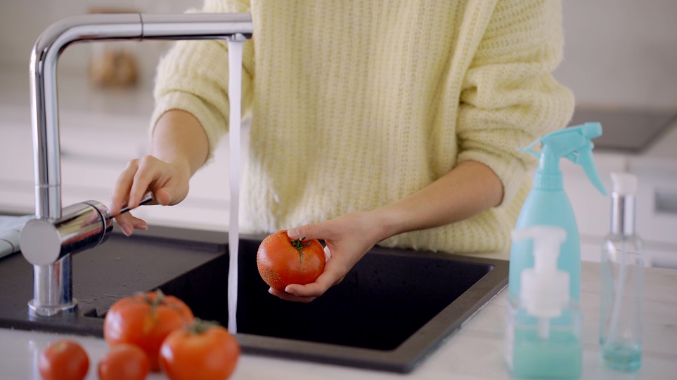 Βήμα 3: Ξεπλένουμε καλά τα φρούτα και τα λαχανικά με νερό, τρίβοντας τυχόν βρωμιά με τα δάχτυλά μας και τα στεγνώνουμε με ένα καθαρό πανί ή χαρτί κουζίνας.