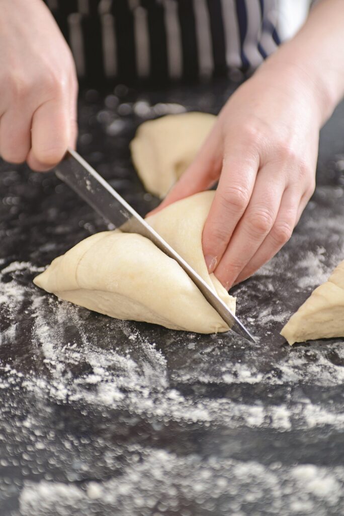 1. Μεταφέρουμε τη ζύμη σε μια ελαφρά αλευρωμένη επιφάνεια και τη χωρίζουμε σε δέκα μπαλίτσες των 85 γρ. η καθεμία.