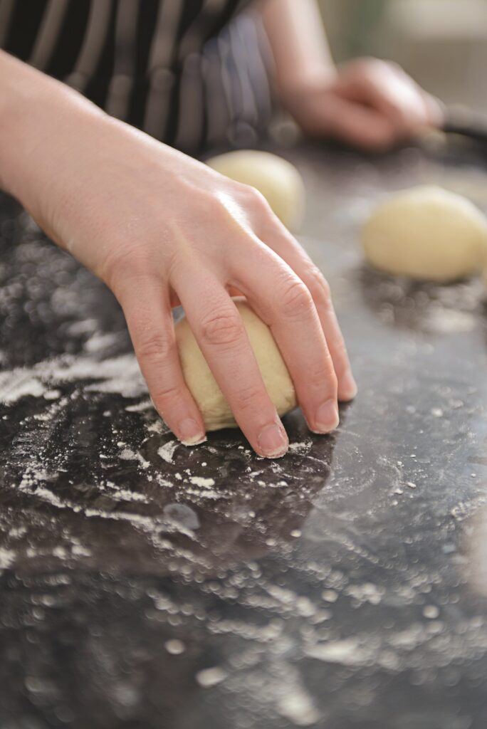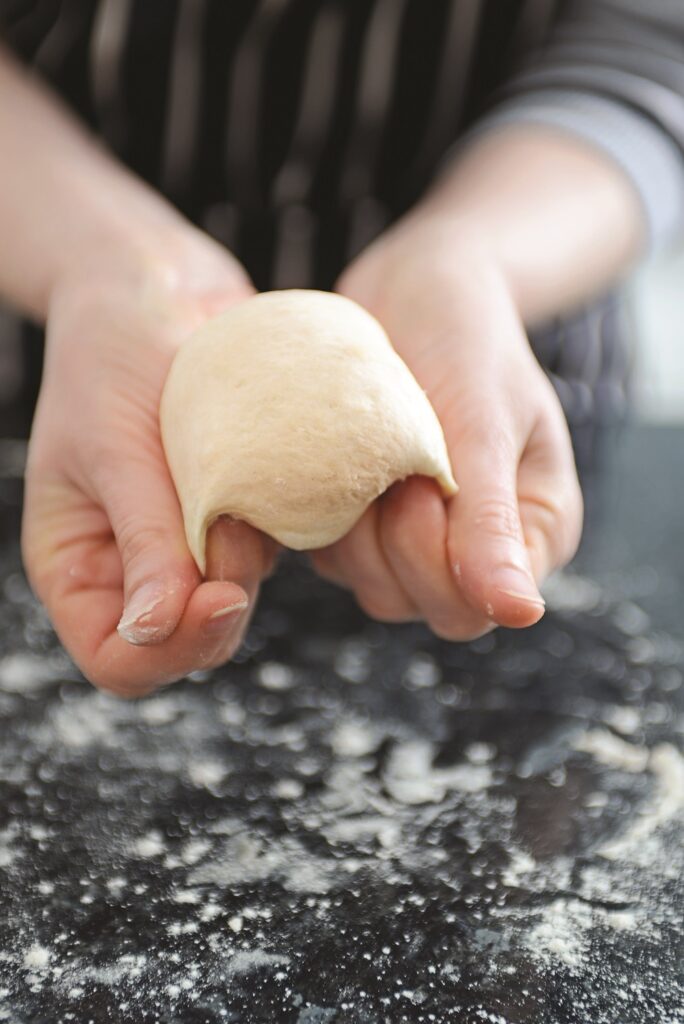 3. Ακουμπάμε την μπάλα ζύμης στον πάγκο και την κουνάμε κυκλικά μέσα στην παλάμη μας για να πάρει ακόμα πιο στρογγυλό σχήμα.