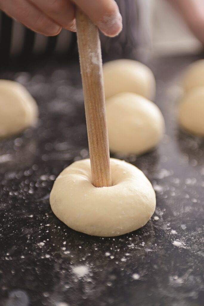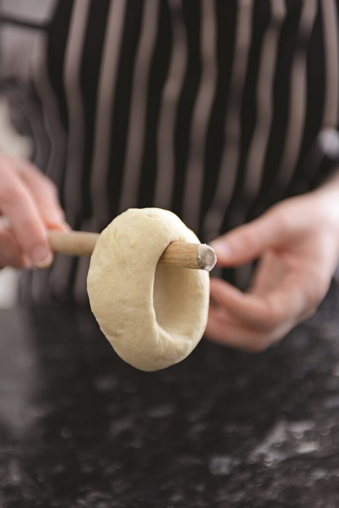 5. Την περνάμε μέσα από τη ζύμη και τη στριφογυρίζουμε γύρω από τη λαβή μέχρι να σχηματιστεί μια τρύπα με διάμετρο 3 εκ. – πρέπει να είναι αρκετά φαρδιά γιατί το ζυμάρι απλώνει. Καλύπτουμε κάθε bagel ελαφρά με αλουμινόχαρτο μέχρι να δώσουμε σχήμα και στα υπόλοιπα. Βάζουμε μπόλικο νερό σε μια κατσαρόλα, το αφήνουμε να βράσει και ρίχνουμε τη σόδα – θα αφρίσει πολύ έντονα.