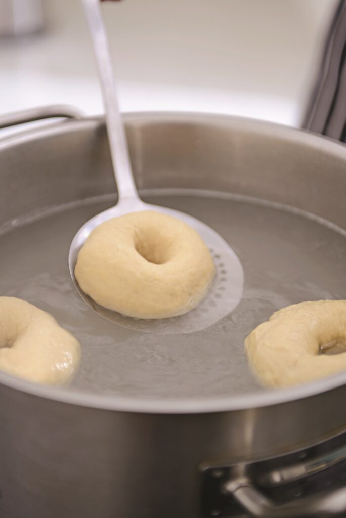 6. Βουτάμε ένα ένα τα bagels –όχι παραπάνω από 4 τη φορά– στο νερό που βράζει για 1΄, αναποδογυρίζοντάς τα με μια τρυπητή κουτάλα, μέχρι να φουσκώσουν ελαφρώς και να δημιουργηθεί μια πέτσα.
