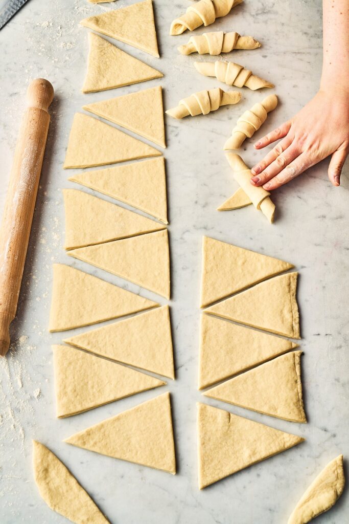 6. Παίρνουμε ένα τρίγωνο ζύμης, το τραβάμε ελαφρώς να γίνει πιο μακρύ και το ρολάρουμε σε μικρό κρουασάν.