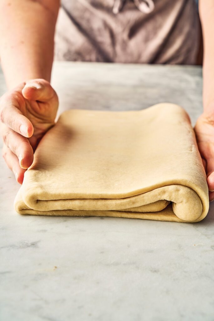 4. Ανοίγουμε ξανά τη ζύμη σε ορθογώνιο σχήμα, διαστάσεων 50×30 εκ. Διπλώνουμε προς τα μέσα το 1/3 προς το κέντρο και ξανά το άλλο 1/3 προς το κέντρο. Τέλος, διπλώνουμε ξανά τη ζύμη στη μέση έτσι ώστε οι ραφές να βρίσκονται στη μία λευρά. Αφήνουμε στο ψυγείο για 30΄. Επαναλαμβάνουμε τη διαδικασία για δύο ακόμα φορές και την αφήνουμε στο ψυγείο όλη τη νύχτα.