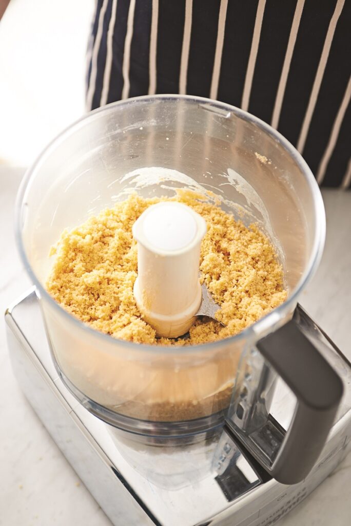 1. Ρίχνουμε το αλεύρι, το σιμιγδάλι, τα δύο ολόκληρα αυγά και τον έναν κρόκο σε μούλτι ή μπλέντερ και χτυπάμε μέχρι να σχηματιστεί η ζύμη σαν τρίμματα (προσθέτουμε και τον άλλο κρόκο αυγού αν δούμε ότι το ζυμάρι μας έχει περισσότερο αλεύρι και δείχνει στεγνό).