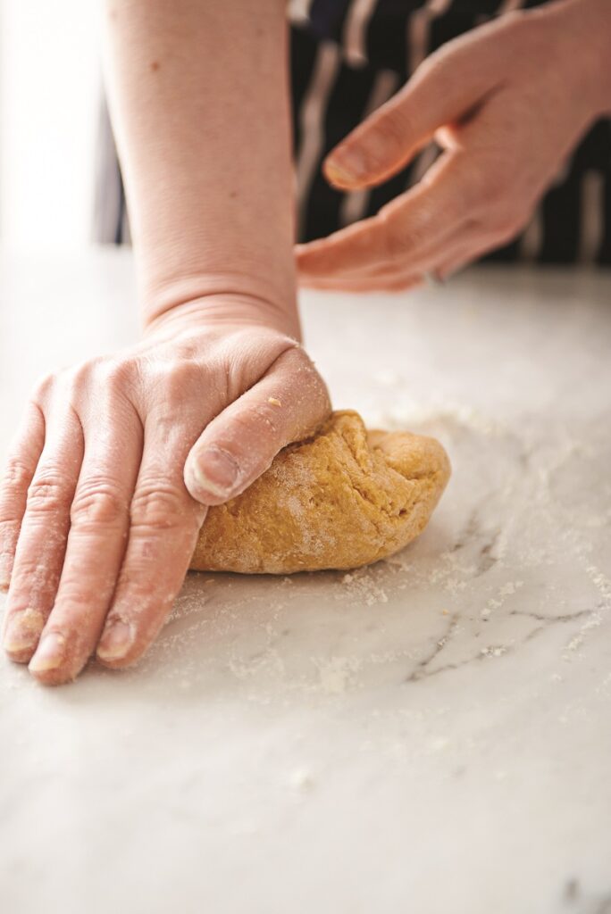 2. Αδειάζουμε το μείγμα στον πάγκο της κουζίνας μας και το ζυμώνουμε μέχρι να γίνει εύπλαστο. Ζυμώνουμε για λίγα λεπτά, πασπαλίζοντας με λίγο αλεύρι αν κολλάει πολύ στα χέρια μας, μέχρι να γίνει μαλακή η ζύμη. Την πλάθουμε σε μπάλα, την τυλίγουμε με αλουμινόχαρτο ή μεμβράνη και τη βάζουμε στο ψυγείο για 30’.