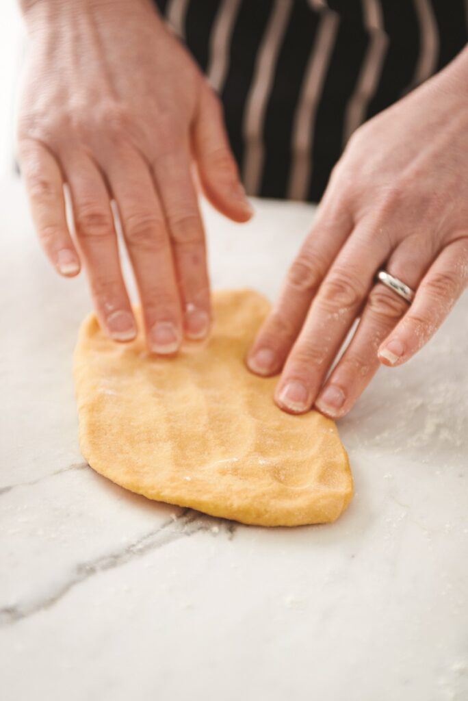 3. Κόβουμε τη ζύμη στη μέση. Παίρνουμε το ένα κομμάτι και το ανοίγουμε με τα χέρια μας σε ορθογώνιο σχήμα (όσο μπορούμε).