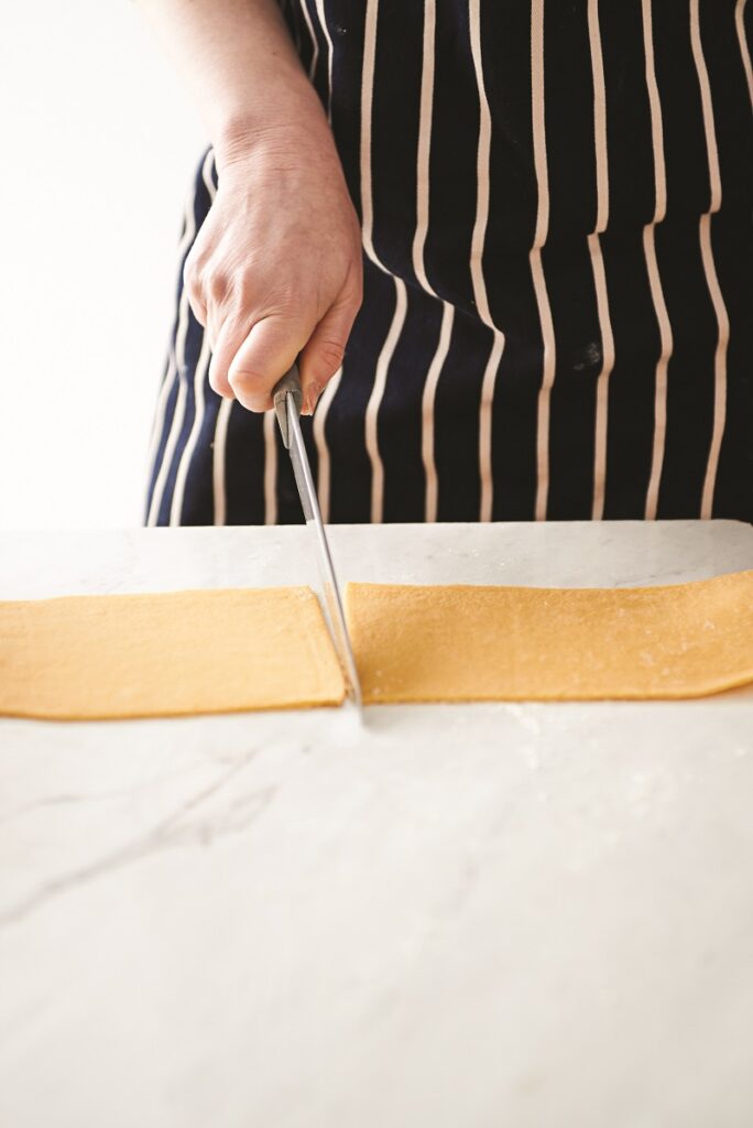 4. Περνάμε την άκρη της ορθογώνιας ζύμης από τη μηχανή των ζυμαρικών, στην πιο μεγάλη, «χοντρή» ρύθμιση. Ακολουθούμε την ίδια διαδικασία και με το άλλο κομμάτι ζύμης.