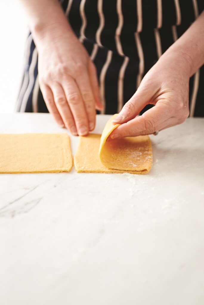 6. Διπλώνουμε το πρώτο κομμάτι ανοιγμένου ζυμαριού στη μέση και κατόπιν άλλη μία φορά και το περνάμε ξανά από τη μηχανή.