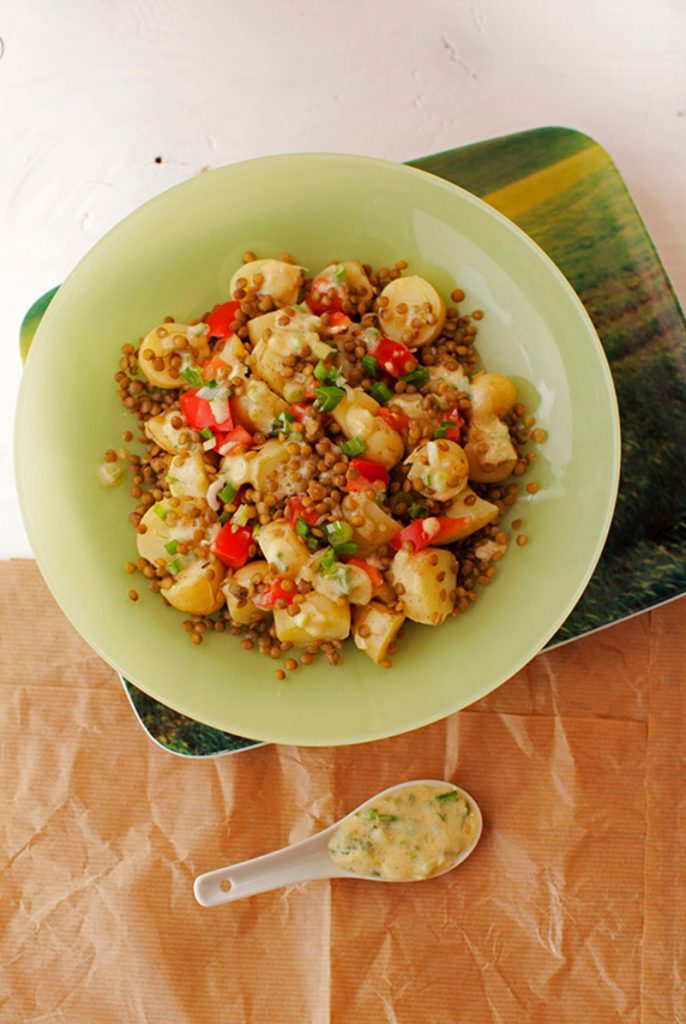 Μία διαφορετική φακοσαλάτα με τηγανητές ολόκληρες πατατούλες και πολύ αρωματική σάλτσα δυόσμου.