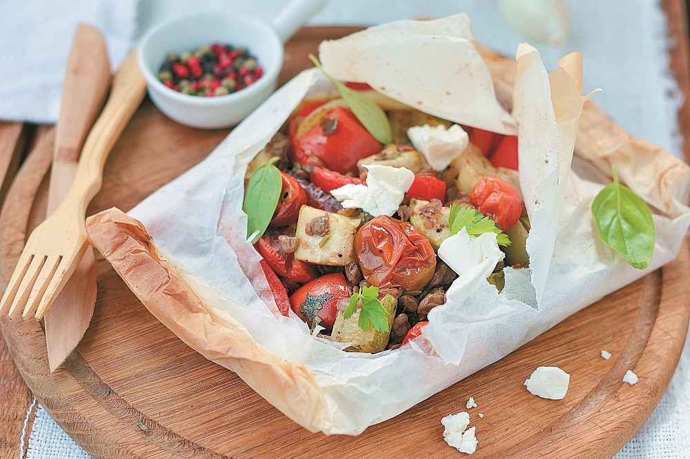 Φακές σαλάτα στο χαρτί, με κολοκυθάκια, ντοματίνια και φέτα