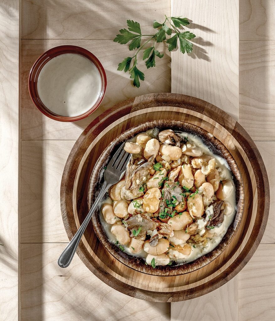 Γίγαντες στον φούρνο με μανιτάρια, λευκή σάλτσα αρωματισμένη με μαστίχα Χίου