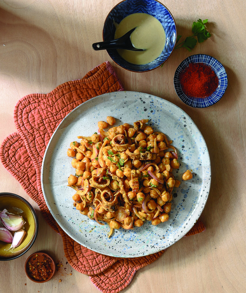 Φτιάχνουμε ζεστή σαλάτα με ρεβίθια µε ταχίνι και πικάντικο θράψαλο. Νηστίσιμη και απολαυστική για κάθε ημέρα.