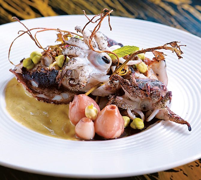 Σουπιές στη σχάρα με αμπελοβλάσταρα και σάλτσα από φρέσκα ρεβίθια