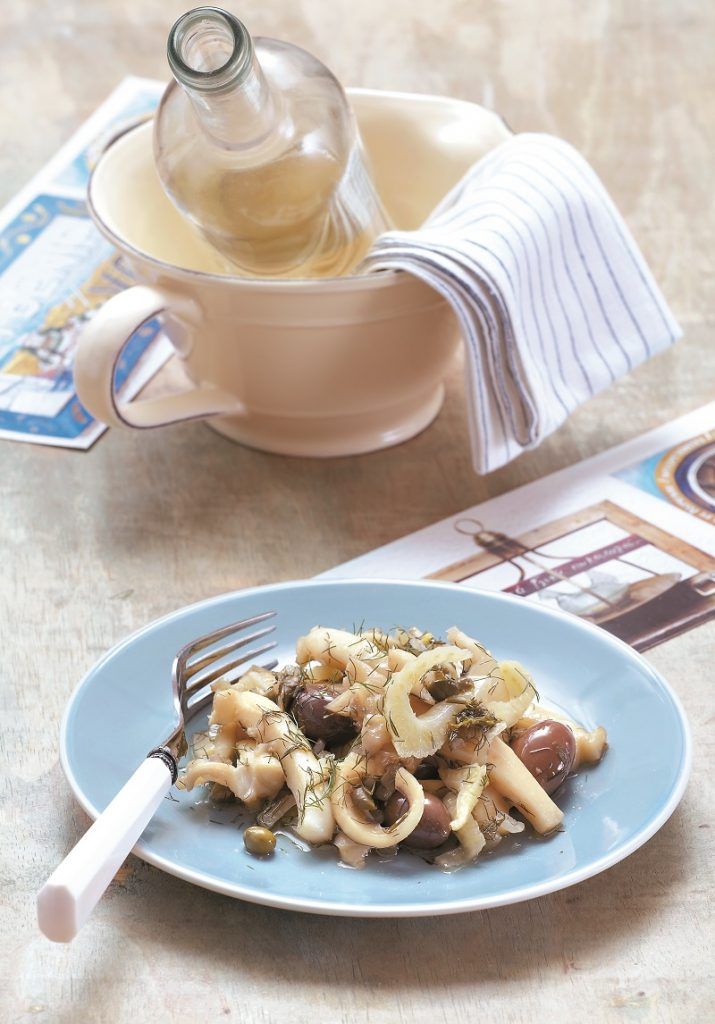 Σουπιές κρασάτες με πράσινες ελιές, κάππαρη και μάραθο