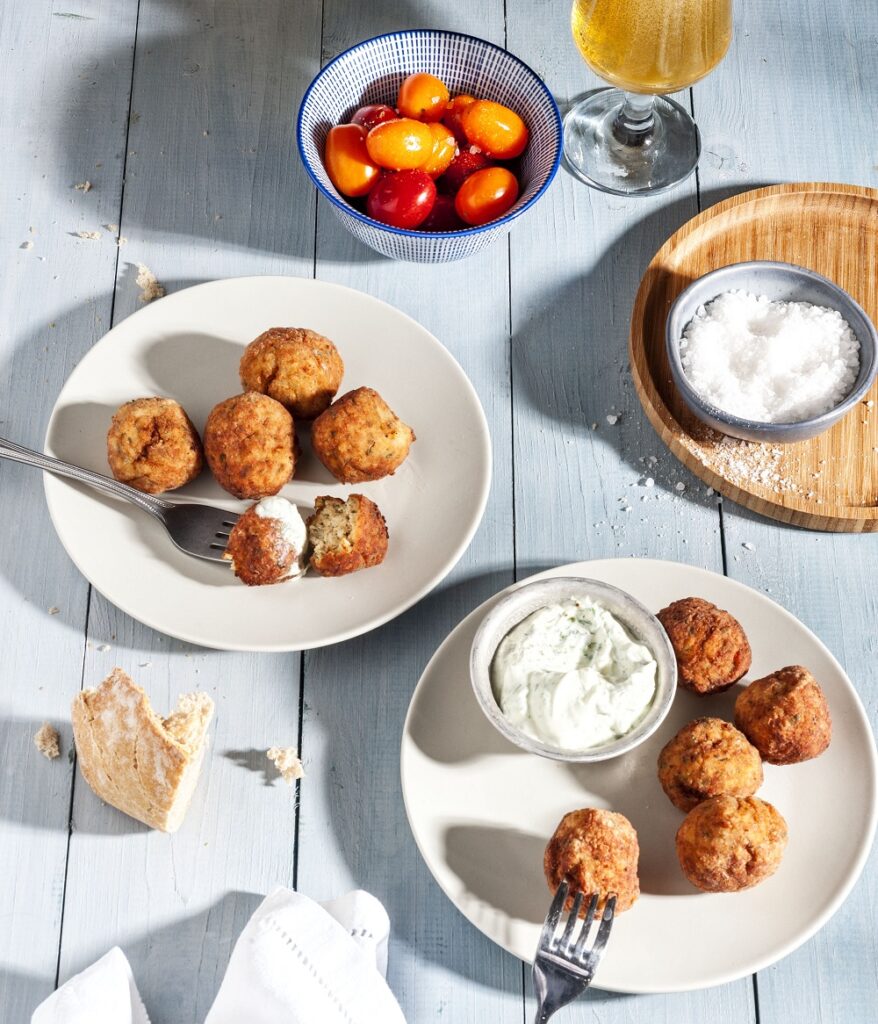 Απολαυστικά κεφτεδάκια, τραγανά και αρωματικά, που συνοδεύονται με ένα δροσερό ντιπ γιαουρτιού.