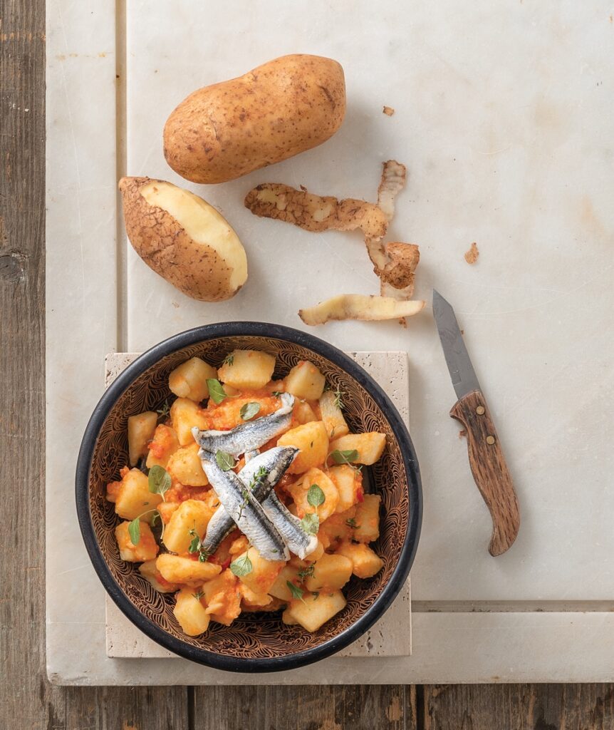 Μια απλούτατη βραστή πατατοσαλάτα μετατρέπεται σε ξεχωριστό ορεκτικό πιάτο με τη συνοδεία μιας κρέμας και μαριναρισμένου γαύρου.