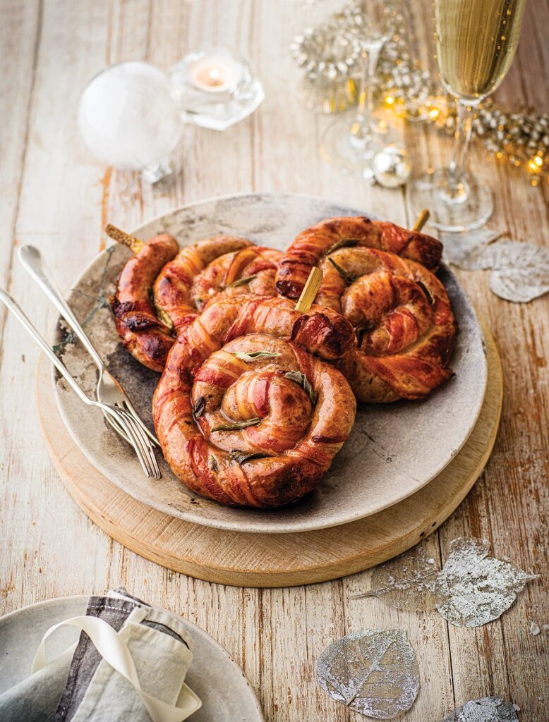Κουλουριαστά λουκάνικα με φασκόμηλο, μέλι και μπέικον