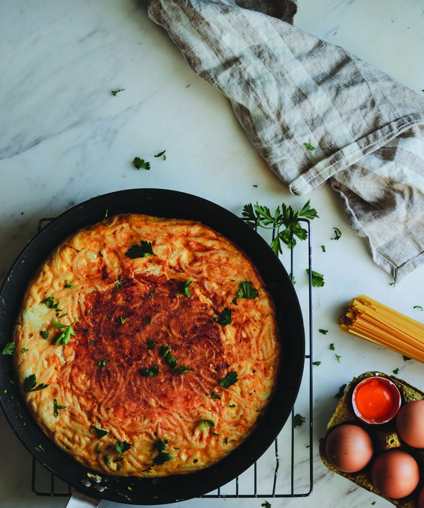 Θυμίζει μια μακαρονόπιτα της στιγμής, και όχι μια απλή ομελέτα, ειδικά αφού κρύβει μέσα της σπαγγέτι που περίσσεψε, φέτα, γιαούρτι και γραβιέρα.