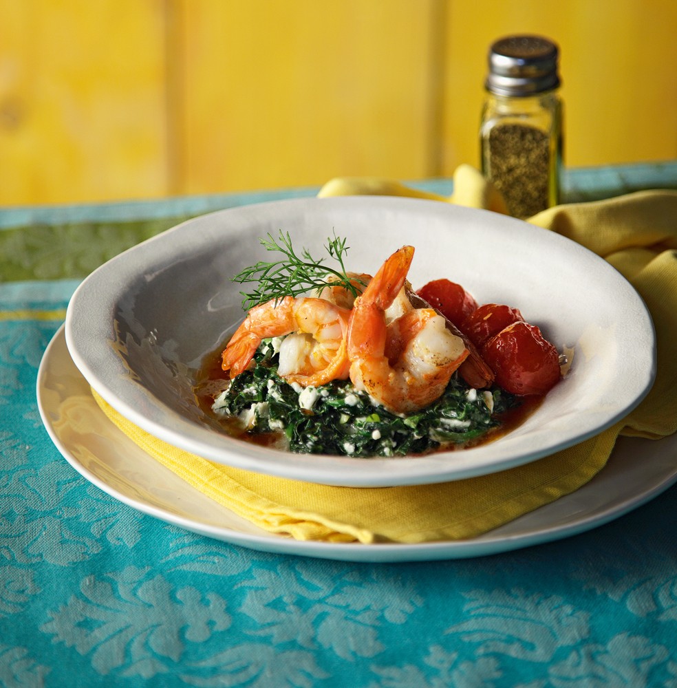 Σκορδάτες γαρίδες με ντοματάκια και σπανάκι