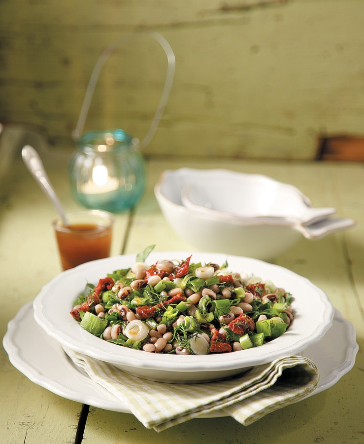 Σαλάτα με μαυρομάτικα φασόλια, λιαστή ντομάτα και σπανάκι