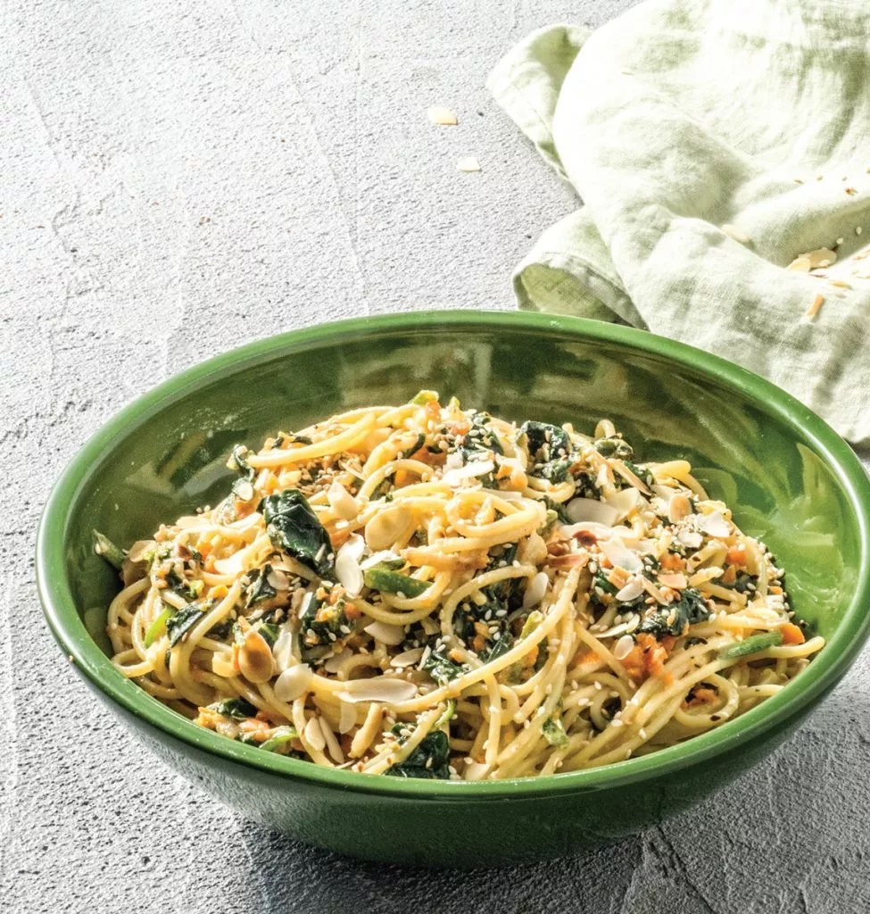 Μακαρονάδα με σπανάκι, ταχίνι και αμύγδαλα