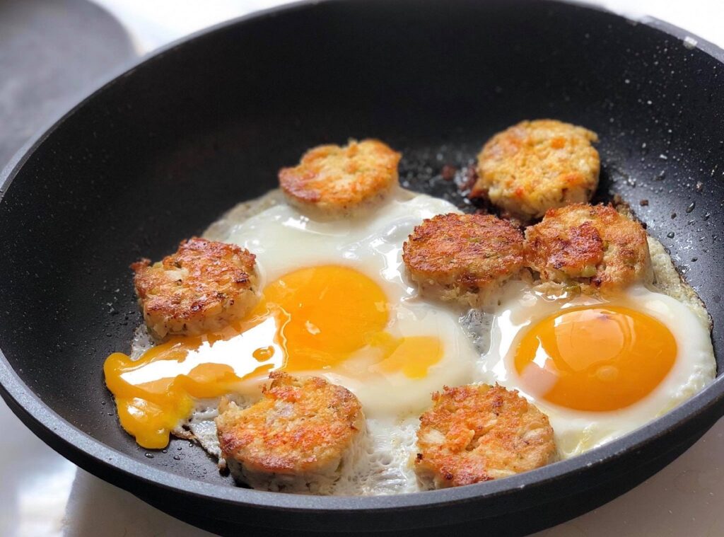 Τσακλατιστά αυγά με φέτα και λουκάνικο