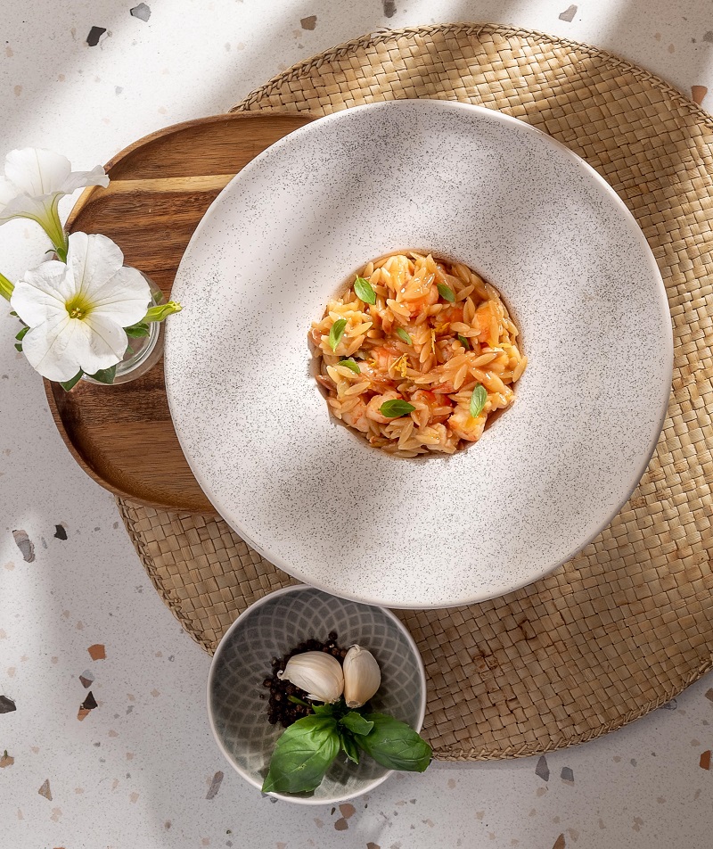 Μόλις χυλώσει και έχει βράσει, προσθέτουμε τον κιμά από τις γαρίδες, ανακατεύουμε και μαγειρεύουμε για 30΄΄-40΄΄. Τραβάμε από τη φωτιά, ρίχνουμε το βούτυρο, την παρμεζάνα, το τριμμένο σκόρδο με το λάδι, τον βασιλικό και το ξύσμα λεμονιού. Ανακατεύουμε για να δέσουν όλα τα υλικά και σερβίρουμε με φρεσκοτριμμένο πιπέρι.