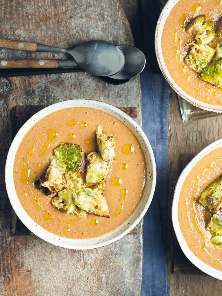 Ρίχνουμε όλα τα υλικά για το γκασπάτσο σε ένα μεγάλο μπολ και ανακατεύουμε καλά. Χρησιμοποιούμε ένα μπλέντερ ή μούλτι για να χτυπήσουμε το μείγμα γκασπάτσο μέχρι να γίνει πολύ λείο, προσθέτοντας περισσότερο αλάτι ή ξίδι ανάλογα τη γεύση μας. Ζεσταίνουμε τον φούρνο στους 200°C στον αέρα. Βάζουμε τις χοντροκομμένες φέτες ψωμιού και το σκόρδο σε ταψί, περιχύνουμε με το λάδι, αλατοπιπερώνουμε και ανακατεύουμε καλά. Ψήνουμε για 12΄-15΄ ή μέχρι να γίνει πραγματικά τραγανό. Βάζουμε το γκασπάτσο σε μπολ και στη συνέχεια ρίχνουμε από πάνω τα κρουτόν και λίγο πέστο με λίγες σταγόνες ελαιόλαδο. Σερβίρουμε αμέσως.