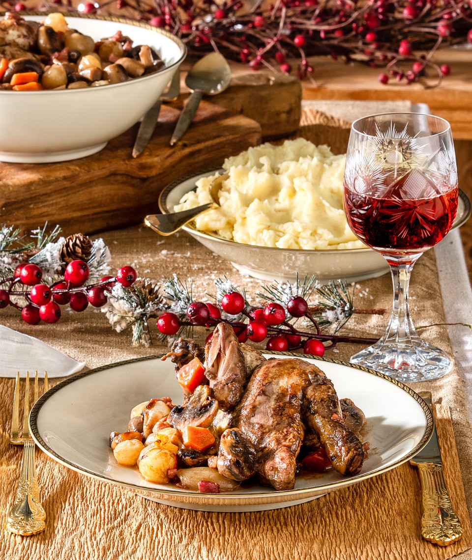 Coq au vin (κόκορας κρασάτος) με πουρέ