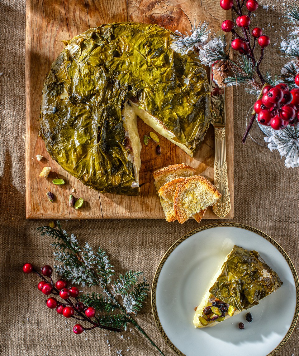 Μπρι τυλιγμένο σε αμπελόφυλλα, με φιστίκια, σταφίδες & καπνιστή πάπρικα