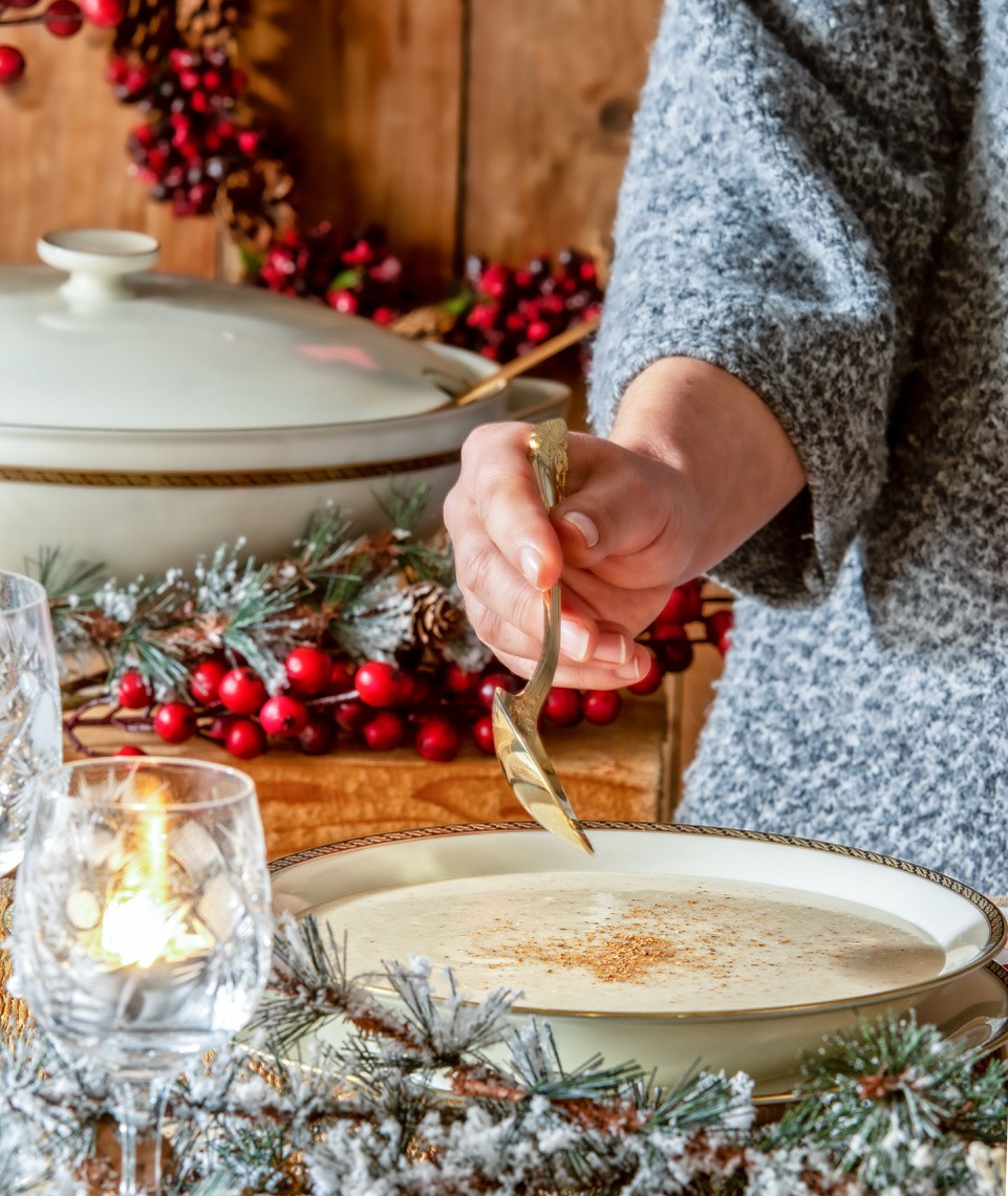 Σερβίρουμε στα πιάτα πασπαλίζοντας με λίγο μοσχοκάρυδο. Εάν θέλουμε, ρίχνουμε κυκλικά φρέσκια κρέμα γάλακτος στο πιάτο.