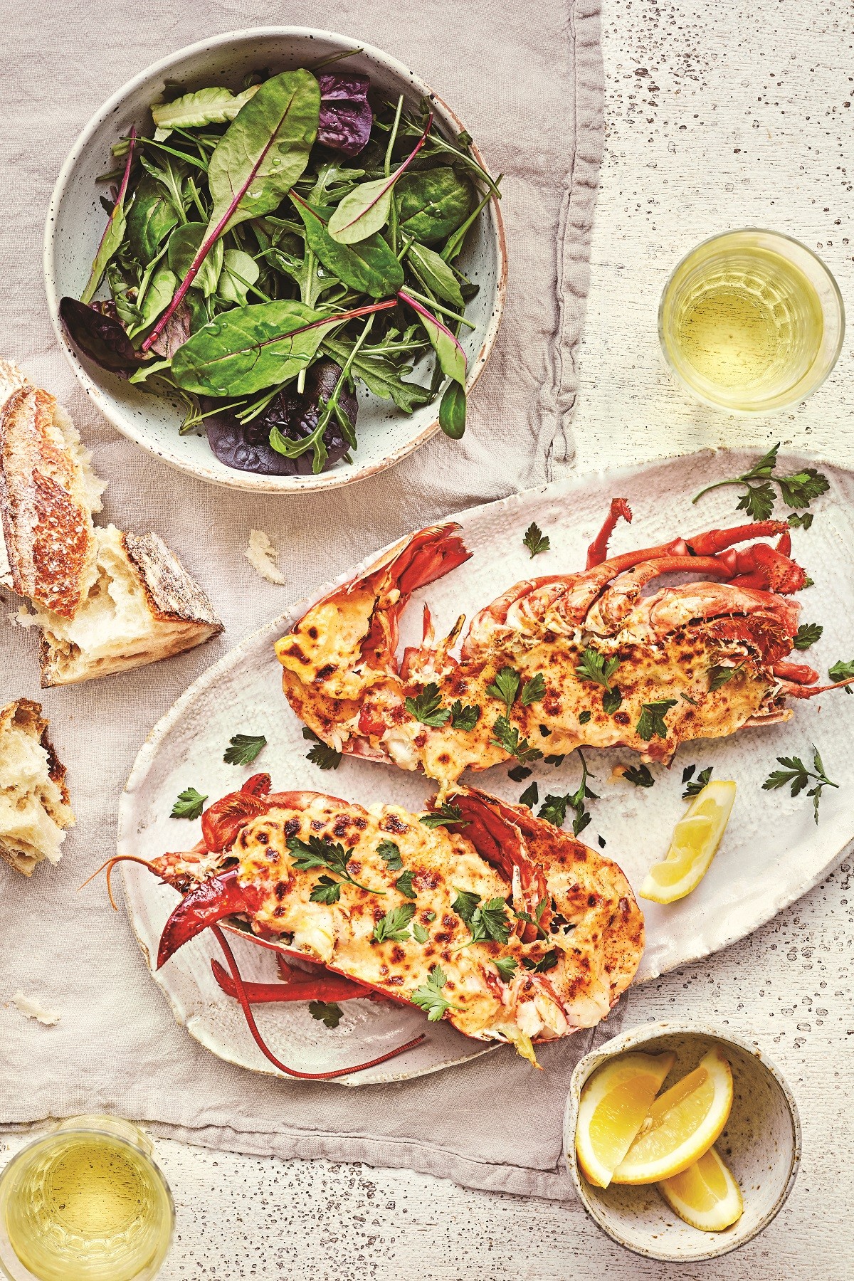 Προθερμαίνουμε το γκριλ του φούρνου στη δυνατή θερμοκρασία. Μοιράζουμε τη μισή σάλτσα στα κελύφη των αστακών, προσθέτουμε τη σάρκα των αστακών και καλύπτουμε με την υπόλοιπη σάλτσα. Πασπαλίζουμε με την υπόλοιπη κεφαλογραβιέρα και ψήνουμε στο γκριλ για 3-4 λεπτά μέχρι να χρυσίσουν. Σερβίρουμε με φρέσκια σαλάτα εποχής.