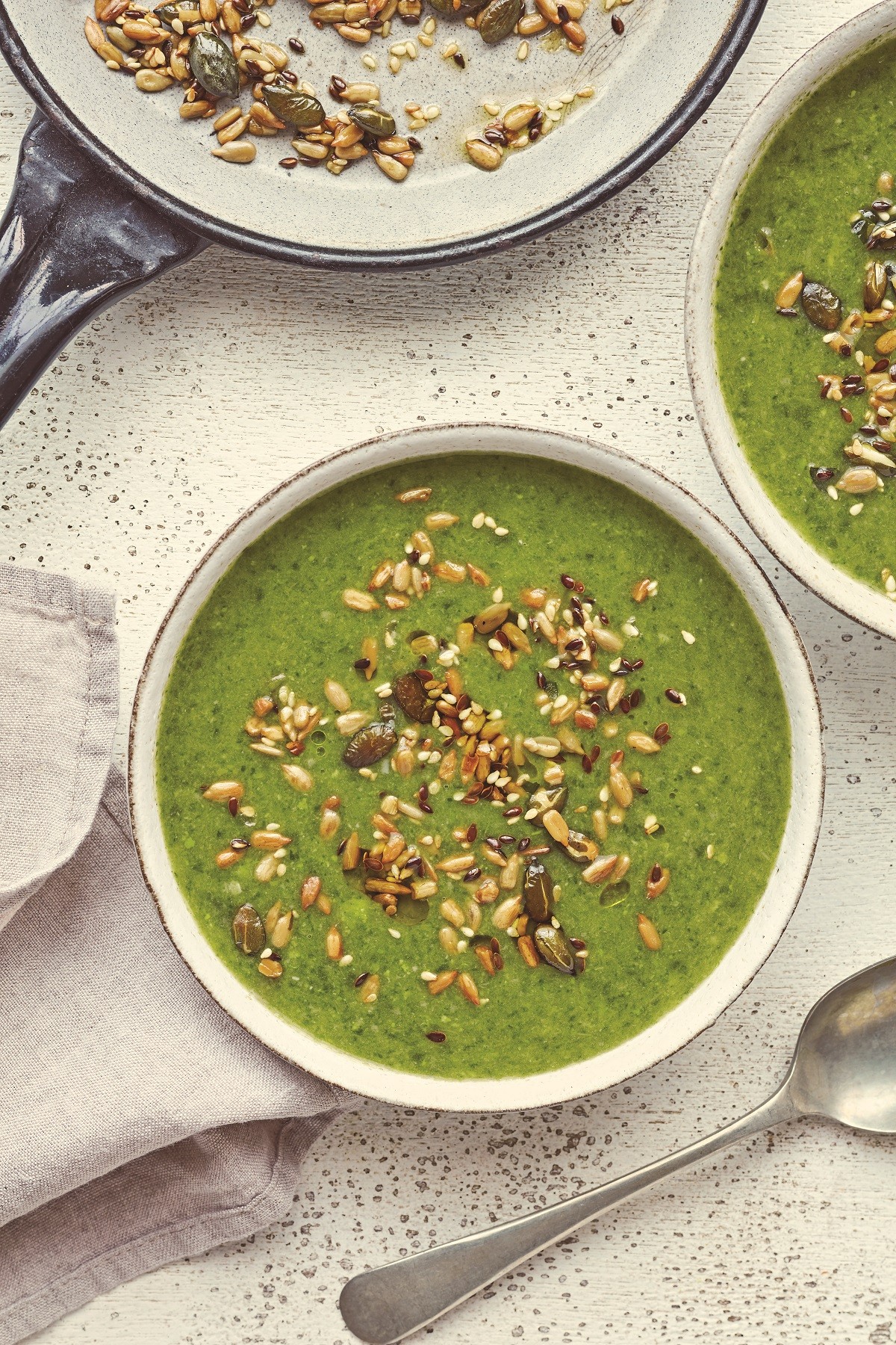 Ρίχνουμε το σπανάκι, τα μυρωδικά και μαγειρεύουμε για 3-4 λεπτά, ανακατεύοντας μέχρι να μαραθεί το σπανάκι. Προσθέτουμε την κρέμα και, αν χρειαστεί, λίγο νερό για να καλυφθούν τα υλικά. Συνεχίζουμε το μαγείρεμα για 10 λεπτά. Βάζουμε τα λαχανικά στον κάδο του μούλτι μαζί με ζωμό από την κατσαρόλα και χυμό από μισό λεμόνι. Προσθέτουμε 50 ml ελαιόλαδο και χτυπάμε να ομογενοποιηθούν καλά όλα τα υλικά μέχρι να έχουμε μια ωραία βελούδινη υφή. Περνάμε τη σούπα από ψιλό σουρωτήρι και την κρατάμε ζεστή. Σερβίρουμε τη σούπα, προσθέτοντας λίγες κορυφές άνηθο, το μιξ σπόρων και λίγες σταγόνες ελαιόλαδο.
