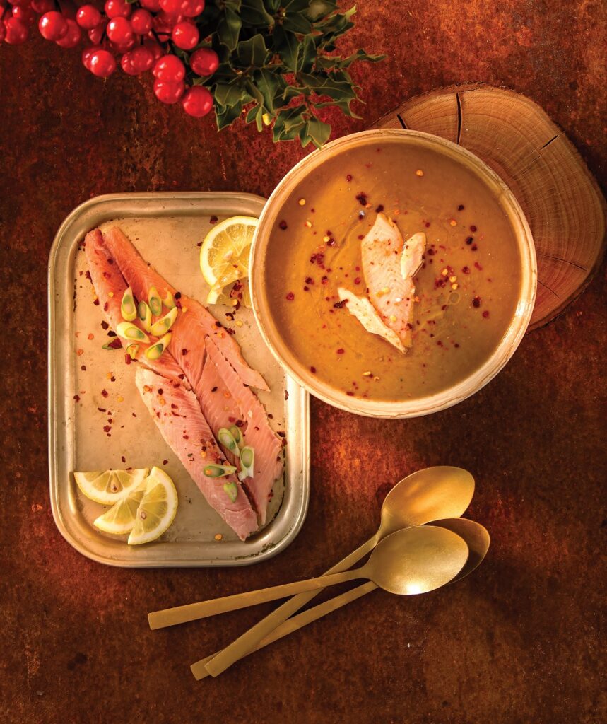 Βελουτέ φακής με καπνιστή πέστροφα και μπούκοβο