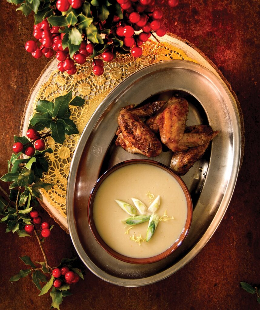 Προσθέτουμε το αλάτι, πιπέρι, ξύσμα από 1 λεμόνι και 70 ml ελαιόλαδο και χτυπάμε επιτόπου με ραβδομπλέντερ μέχρι να πάρουμε μια ομοιογενή, βελούδινη σούπα. Περνάμε τη σούπα από σίτα και σερβίρουμε σε πιάτα ή μπολ με φρέσκο κρεμμύδι και δίπλα τις φτερούγες κοτόπουλου. Ραντίζουμε με επιπλέον ελαιόλαδο.