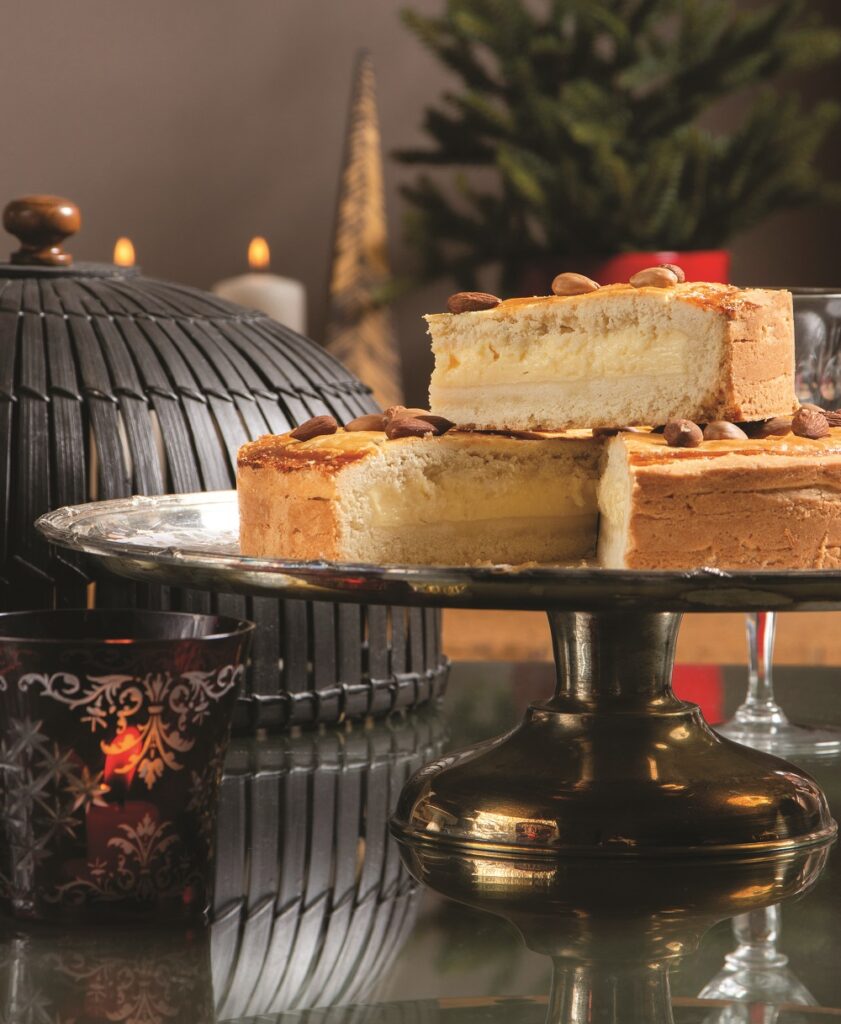 Ζύμη: Βάζουμε στον κάδο του μίξερ το βούτυρο και την άχνη και χτυπάμε μέχρι να γίνει λευκή και αέρινη. Προσθέτουμε το κονιάκ και το αλεύρι και ανακατεύουμε. Αφήνουμε για λίγο κατά μέρος για να σφίξει. Απλώνουμε τη μισή ζύμη σε ένα τσέρκι ή ταψί διαμέτρου 24 εκ. Περιμετρικά, στη βάση, δημιουργούμε ένα στεφάνι από ένα κορδόνι ζύμης σαν φωλιά. Γεμίζουμε με την κρέμα που έχουμε πριν μαλακώσει και, με την υπόλοιπη ζύμη που έχουμε ανοίξει σε φύλλο, καλύπτουμε το γλυκό. Αλείφουμε την επιφάνεια με ασπράδι αυγού και διακοσμούμε με τα αμύγδαλα. Ψήνουμε σε προθερμασμένο φούρνο στους 160°C για περίπου 50΄-60΄.